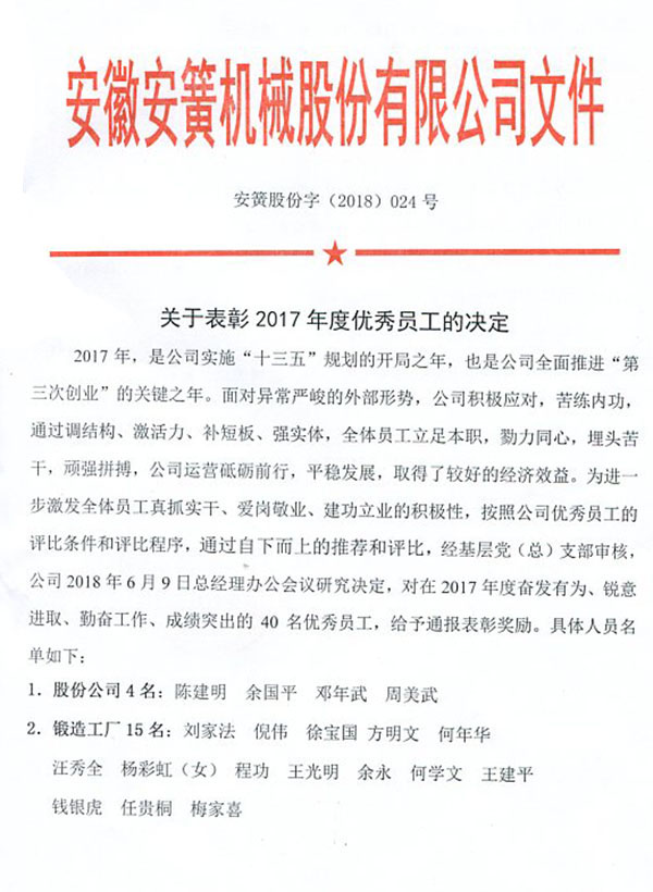 關(guān)于表彰2017年度優(yōu)秀員工的決定