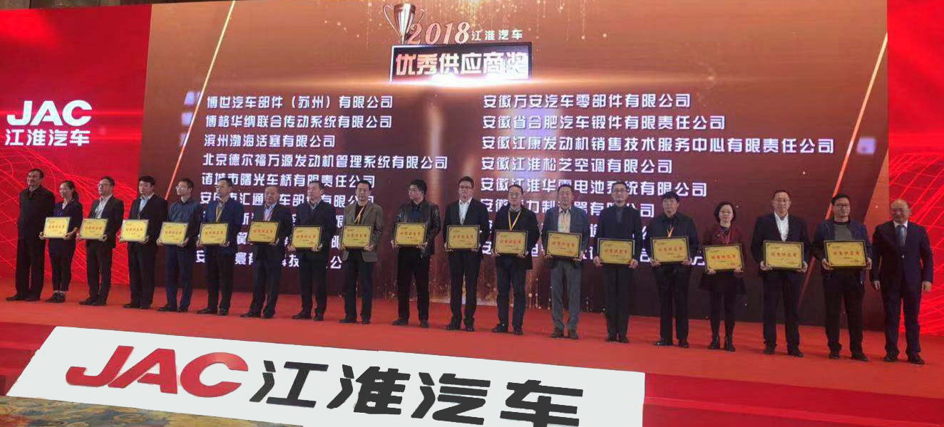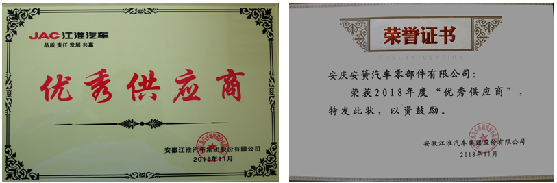2018年11月26-28日,JAC供應(yīng)商大會在合肥召開,安慶安簧汽車零部件有限公司喜獲“2018年度JAC優(yōu)秀供應(yīng)商”稱號。安簧公司一直是JAC的戰(zhàn)略合作伙伴,2018年安簧公司深度配合JAC公司在市場披荊斬棘,再創(chuàng)佳績;本次殊榮的獲得將激勵、鞭策公司攜手JAC再接再厲,戮力前行,共創(chuàng)未來。